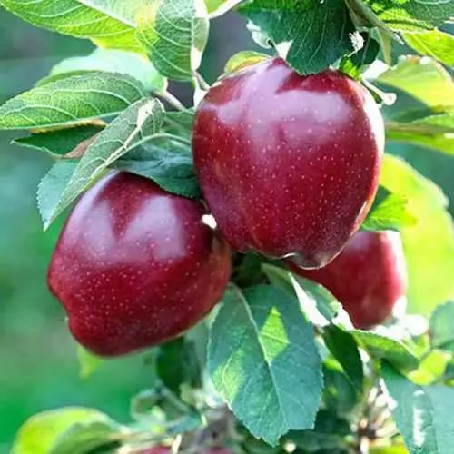 Плоды этого сорта имеют округло-коническую или коническую форму, достигают внушительных размеров и могут весить до 300 граммов. Их отличает яркая, темно-красная окраска с румянцем, который покрывает всю поверхность. На солнечной стороне плоды приобретают насыщенный красный оттенок, что делает их особенно привлекательными. Вкус яблок Ред Делишес кисло-сладкий, а мякоть нежная, зеленовато-кремовая, с высокой сочностью и внушительной хрусткостью. Плоды обладают приятным ароматом и содержат в своем составе до 15,5% сухих веществ и 9,5-11,8% сахаров, что делает их идеальными для употребления в свежем виде и для приготовления соков.